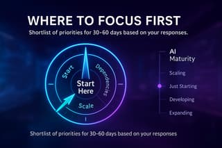 Receive a shortlist of where to start depending on your AI maturity plus focus areas drawn from your answers, so you know what to tackle first over the next 30–60 days.