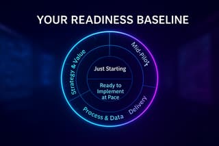 Get a 15-point AI Automation Readiness Score in ~5 minutes and see your stage (Just Starting / Mid-Pilot / Ready to Implement at Pace) across Strategy & Value, Process & Data, and People & Delivery.