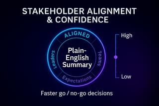 Use a shared, plain-English summary to align leaders and teams, set expectations, and make quicker go/no-go decisions—before committing time or budget.